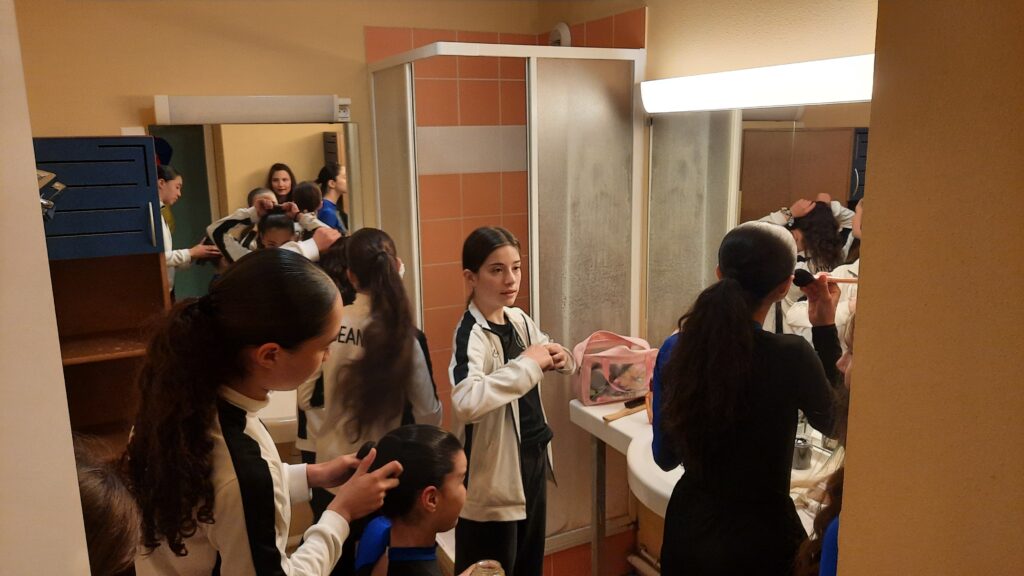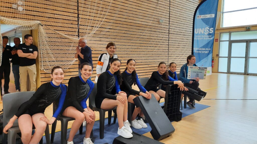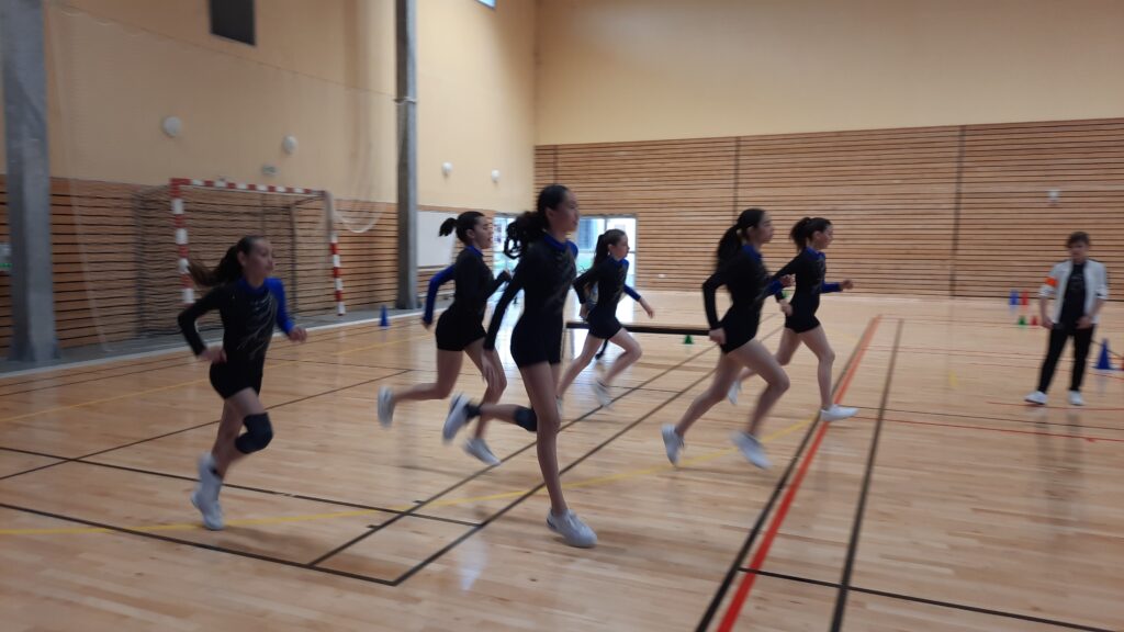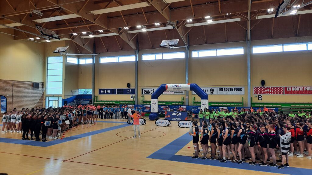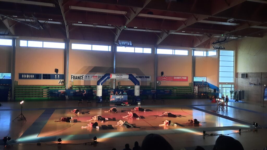 Le lendemain, le réveil sonnait tôt, 5h30 pour les préparatifs de chacune. Notre équipe avait été tirée au sort pour lancer la compétition. Dans un parcours avec un timing précis, les steppeuses ont pu s’échauffer avec les indications de Chloé leur jeune coach, puis réaliser la chorégraphie une fois sans musique, et une fois avec musique. Le moment du premier passage était ensuite venu, et une petite pression suivait les filles lors de leur entrée dans le grand gymnase devant le public. Notre équipe était aussi scrutée, car l’ancienne génération avait remporté le titre national l’année précédente à Périgueux, donc nous étions encore considérés comme les champions en titre. Ce premier passage fut bien effectué, avec une belle énergie malgré quelques fautes de synchro dues au stress, mais le plus dur était fait. La suite des passages des autres équipes de collèges où nous avons pu observer en spectateur, nous a prouvé que l’équipe était bien à sa place.