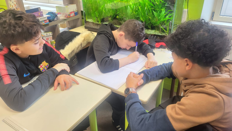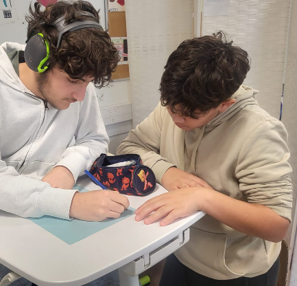 Chaque mardi de 11h à 11h30 ou dès qu’ils le peuvent, Zacharie et Hatem, élèves de 5e6, font un choix remarquable : au lieu d’aller en permanence ou en récréation, ils se rendent dans l’ULIS pour apporter leur aide aux élèves.