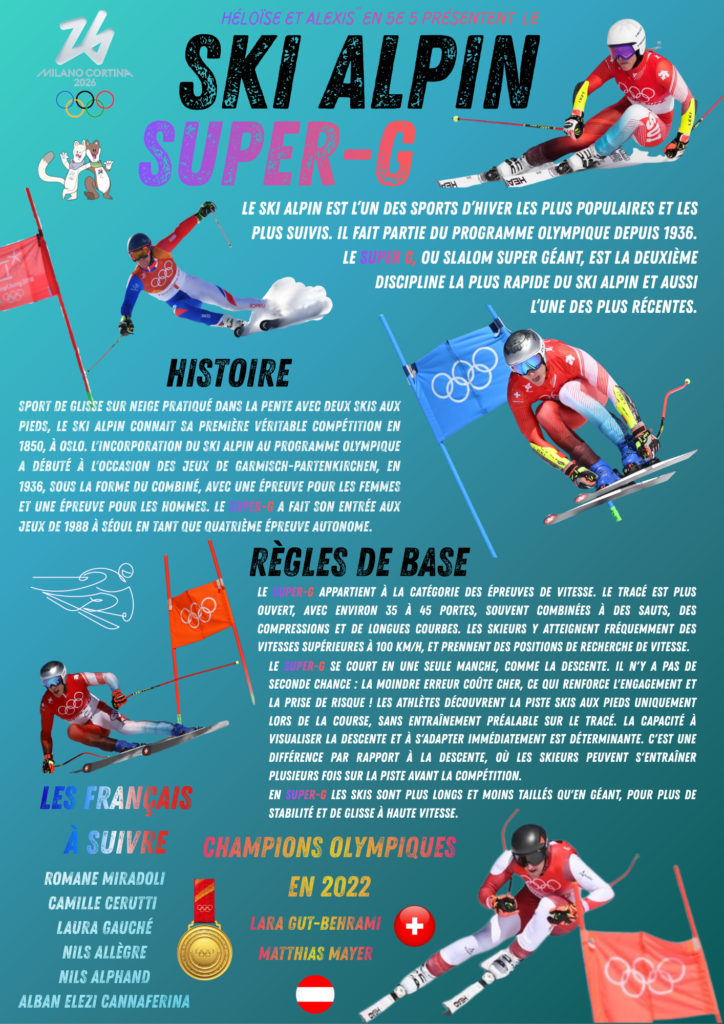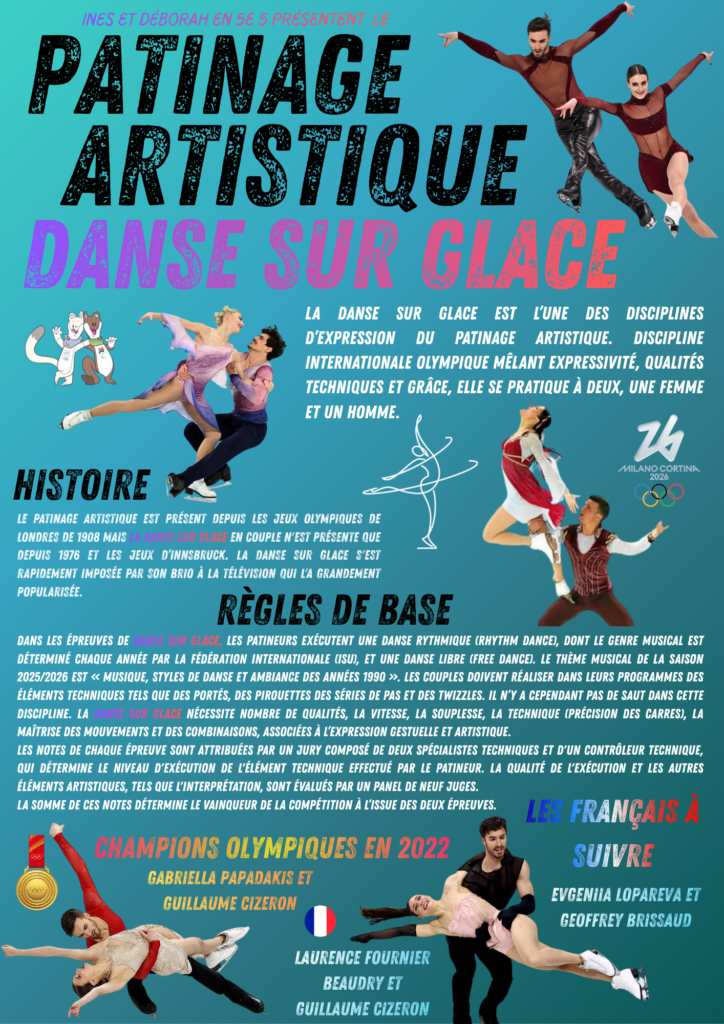Dans le cadre d’un travail mené depuis le mois de novembre, les élèves de 5e 5 et de 5e 7 ont réalisé des exposés portant sur les différentes disciplines des Jeux Olympiques d’hiver 2026 de Milan-Cortina d’Ampezzo. Chaque binôme a mené des recherches afin de découvrir les règles, le matériel, l’histoire, les qualités requises, et les spécificités de chaque sport. Ils et elles ont également présentés les champions de chaque discipline ainsi que les espoirs français. Ces exposés ont ensuite été présentés à chaque début de cours d’EPS à toute la classe.