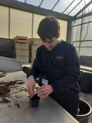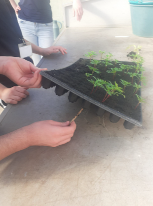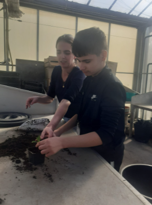 « On a travaillé sur un œillet d’Inde. J’ai sorti la plante avec une baguette pour la mettre dans un godet et j’ai ajouté du terreau. »